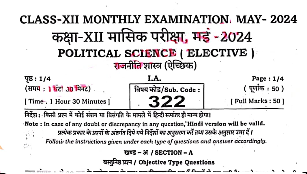 Bihar Board कक्षा 12वीं विज्ञान संकाय में Political Science मासिक परीक्षा वायरल प्रश्न उत्तर पहले Objective Answer Key है उसके बाद Subjective Answer Key है जिसमें Objective ऊपर दिए गए हैं और Subjective सबसे नीचे दिए गए हैं।